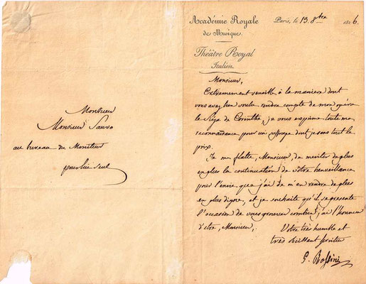 「 ロッシーニの自筆書簡 オデオン劇場監督宛、1826年9月18日付」