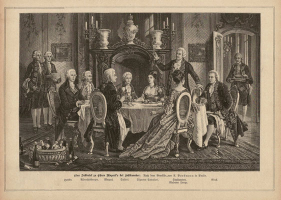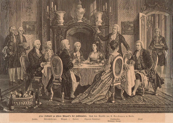 左から「シカネーダー邸でのモーツァルト歓迎宴会 (1880年の新聞『Die Gartenlaube』に掲載された木版画。人物は左から、ハイドン、アルブレヒツベルガー、モーツァルト、サリエーリ、カヴァリエーリ夫人、シカネーダー、ランゲ夫人、グルック)」「同じ新聞で色目の異なる木版画」「掲載新聞の裏面説明文」「歌劇《ダナオスの娘たち》1817年パリ・オペラ座4幕版の印刷台本タイトル頁」