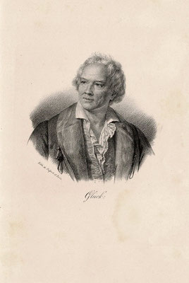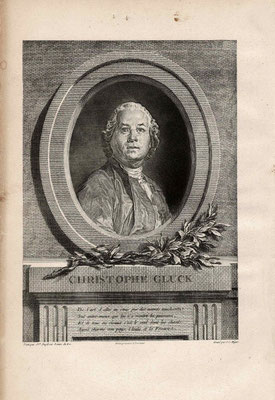 左から「ヨーゼフ2世の肖像。ルイ16世の宮廷画家ジョゼフ・デュクルー(Joseph Ducreux,1735-1802)が1771年に描いた肖像画を基にルイ=ジャック・カトラン(Louis Jacques Cathelin,1738/39-1804)が彫版した腐食銅版画。パリ、1771年」「サリエーリの肖像。ハインリヒ・エドゥアルド・フォン・ヴィンター(Heinrich Eduard von Winter,1788-1825)によるリトグラフ、1815年」「グルックの肖像。デルペック(Delpech)によるリトグラフ、パリ、1840年」「グルックの肖像。J.S.デュプレシスが描いた1790年の肖像に基づくシモン=シャルル・ミジェール(Simon-Charles Miger,1736-1820)の銅版画(A.Durandによるヘリオグラヴュール、1860年代)」