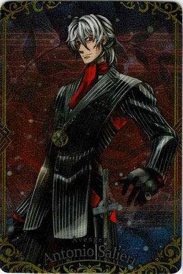 『アマデウス』翻訳書の初版(江守徹 訳、構想社、1984年)、『サントリー音楽文化展 '87 アマデウス (モーツァルトとサリエーリ)』カタログ(1987年)、同じカタログのTBSブリタニア版(1987年)、『アマデウス』1998年4-5月の公演プログラム、2017年9-10月の公演プログラム、同前のチラシ、「FateGrand Order ウエハース7 アントニオ・サリエリ」「FateGrand Order オリジナルミニ色紙」(筆者コレクション)